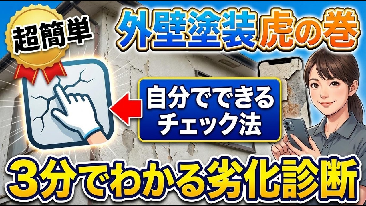 あります。チョーキング(手で触って白い粉がつくか)とひび割れ(目に見えるクラックがあるか)の確認は誰でもできます。詳しいセルフチェック方法は劣化診断ガイドで解説しています。